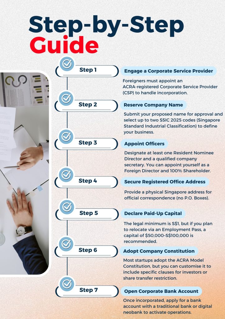 Alongside this, you have to appoint your officers: at least one Resident Nominee Director and a qualified company secretary, while you may simultaneously hold the roles of Foreign Director and 100% shareholder. With documents and officers in place, your CSP will submit the registration to ACRA on your behalf, since foreigners cannot file directly.